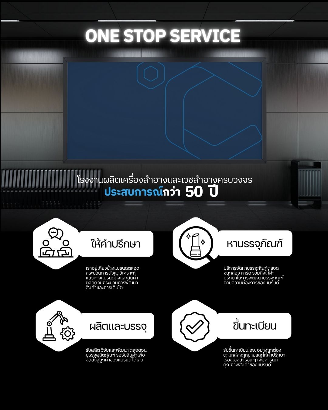 เรามุ่งเน้นในการพัฒนาผลิตภัณฑ์ เพื่ออนาคตของเครื่องสำอางและเวชสำอางไทย ด้วยความจริงใจ พร้อมการันตีระดับสากล